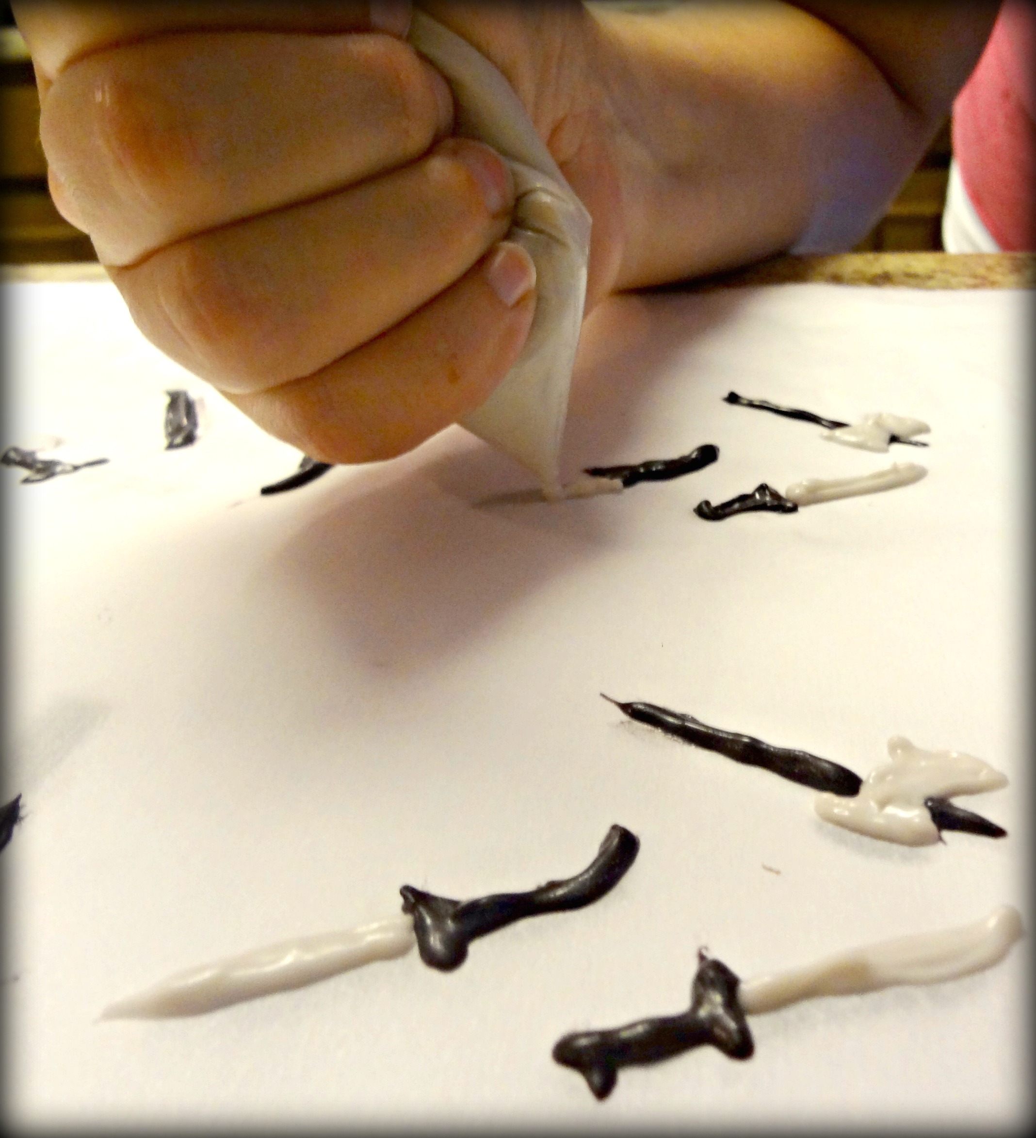 Google image search the weapons you want and print them out.  Lay the sheet under some parchment paper.  Now melt candy melts and pipe with a Ziploc.  Once they have set, you have some mini weapons with which to kill your zombies. (That grammatically correct sentence was for my brother who is always correcting my prepositional usage.)  To get the weapons off the parchment, slide a big ole knife under them, and they should come up easily.  Be careful, though.  They’re fragile.