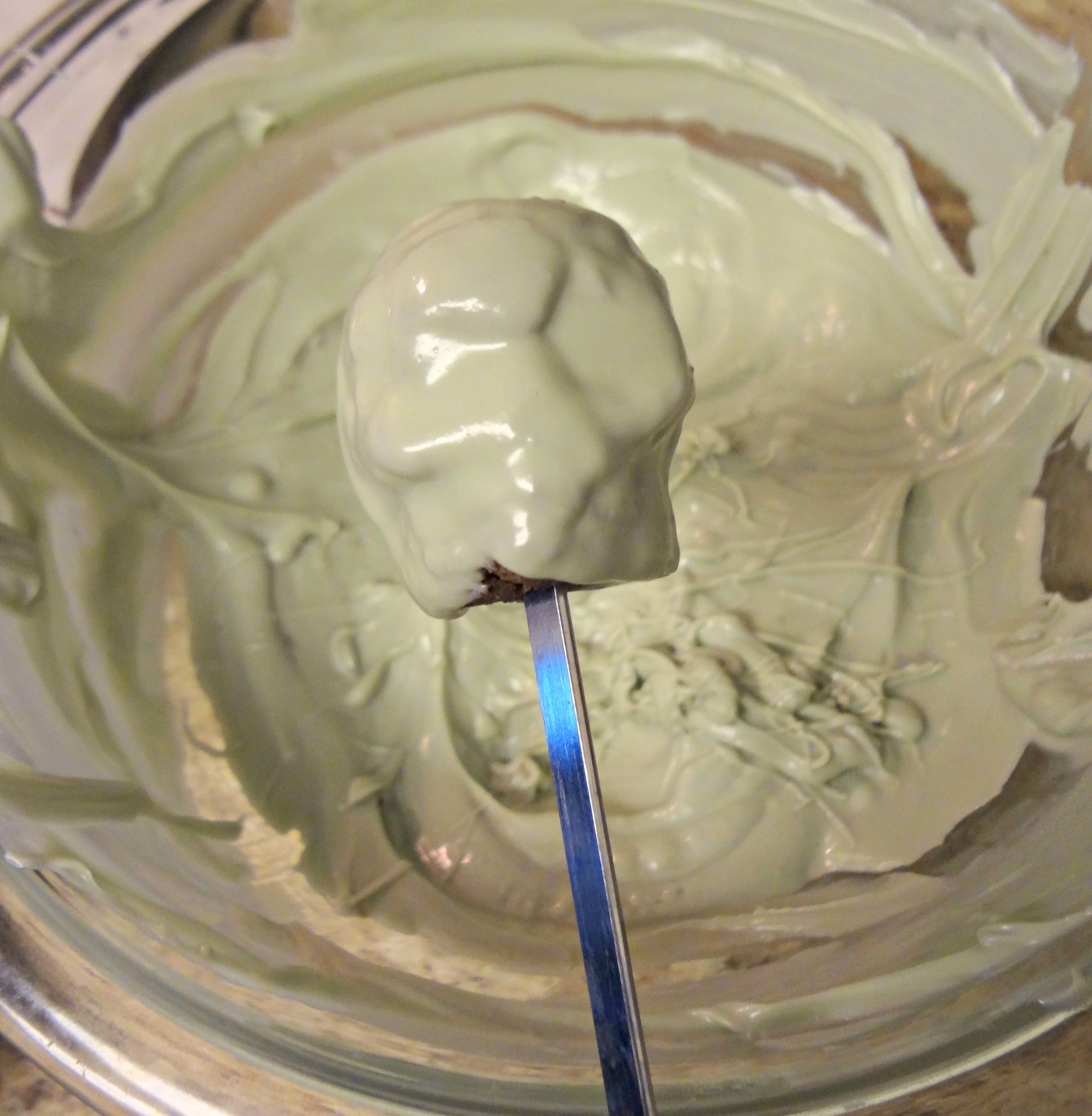 Melt your candy melts per the directions on the bag.  I used a mixture of white, light green, dark green and a teeny bit of black to get a sort of greenish-grey zombie skin color.  Dip those bad boys in there.  I usually dip with a fork, but it wasn’t working out.  So I used a skewer.  The messier the better!