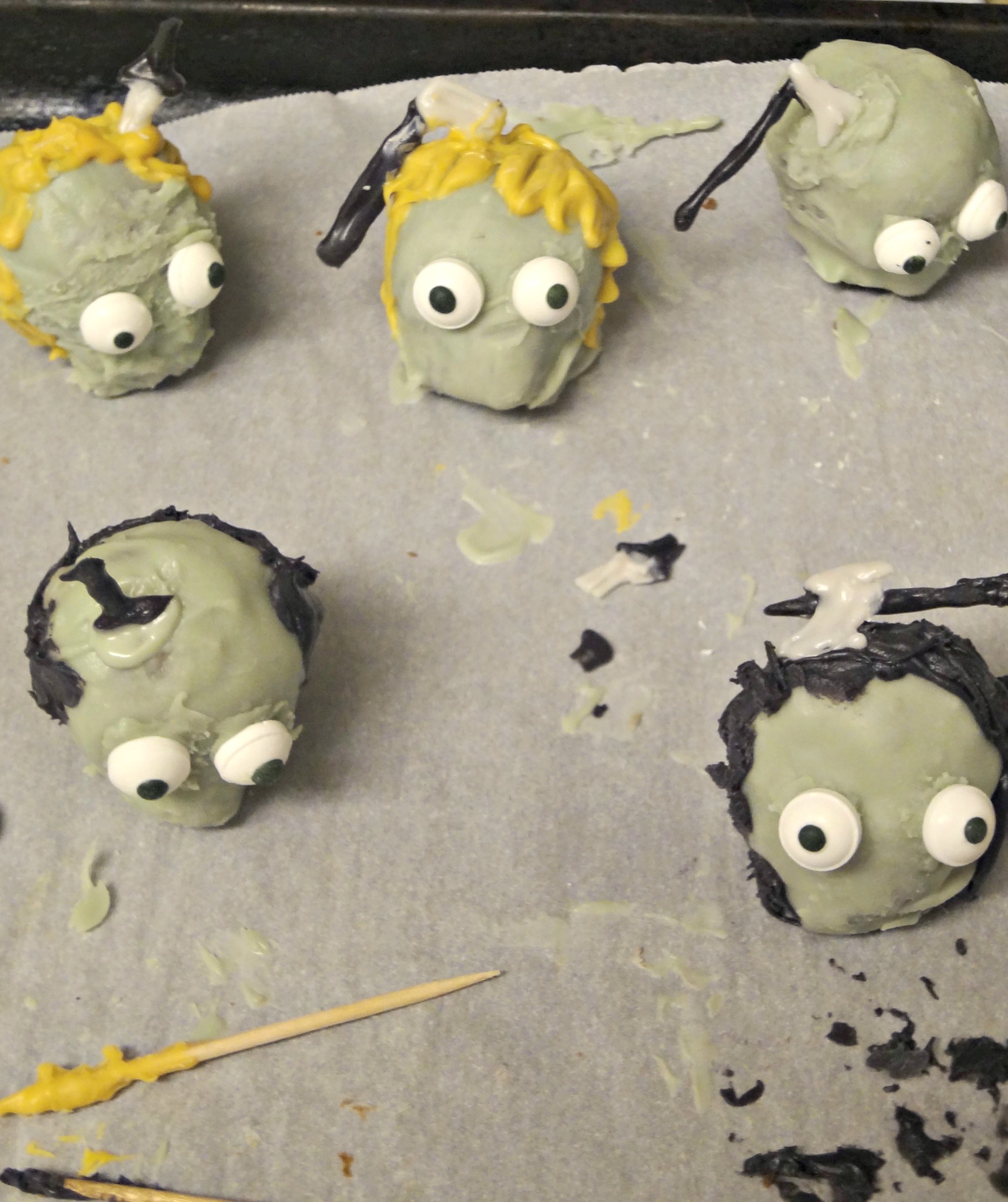 I like these little candy eyes; they make the zombies look more comical and less terrifying.  I got them at Walmart for super cheap.  For the hair, I used black or yellow candy melts.  To stick the weapon on, use some candy melts like glue and stick it on.  Use red candy melts for blood around head wound.  *Note—I bought food writer markers for face details, but apparently they don’t write on lumpy candy melts.  Don’t waste your money on them.