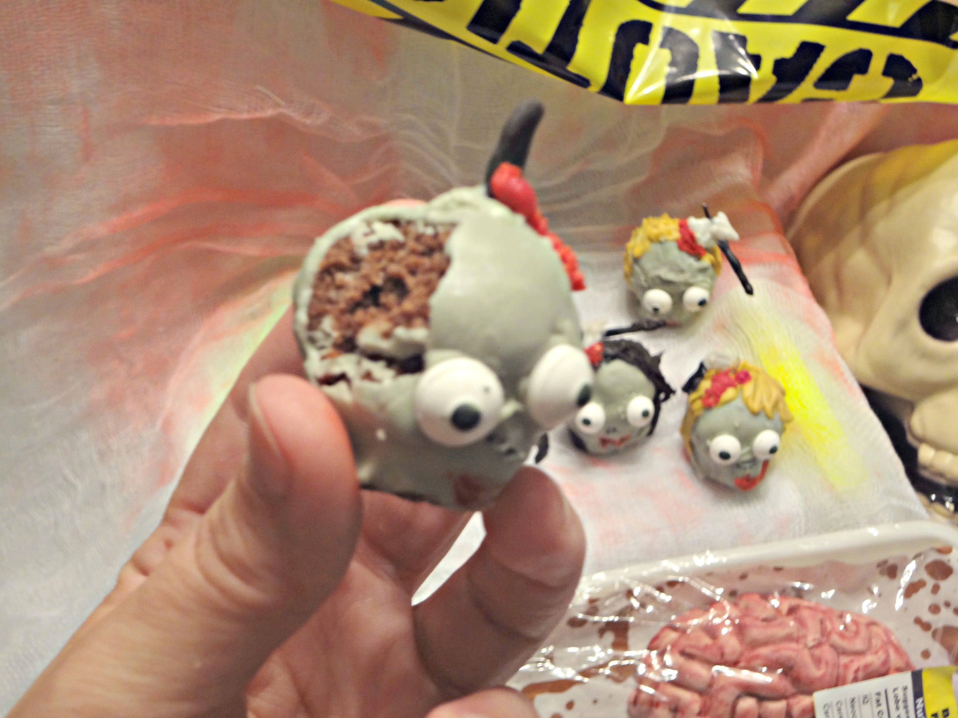 I like these little candy eyes; they make the zombies look more comical and less terrifying. I got them at Walmart for super cheap. For the hair, I used black or yellow candy melts. To stick the weapon on, use some candy melts like glue and stick it on. Use red candy melts for blood around head wound. *Note—I bought food writer markers for face details, but apparently they don’t write on lumpy candy melts. Don’t waste your money on them.