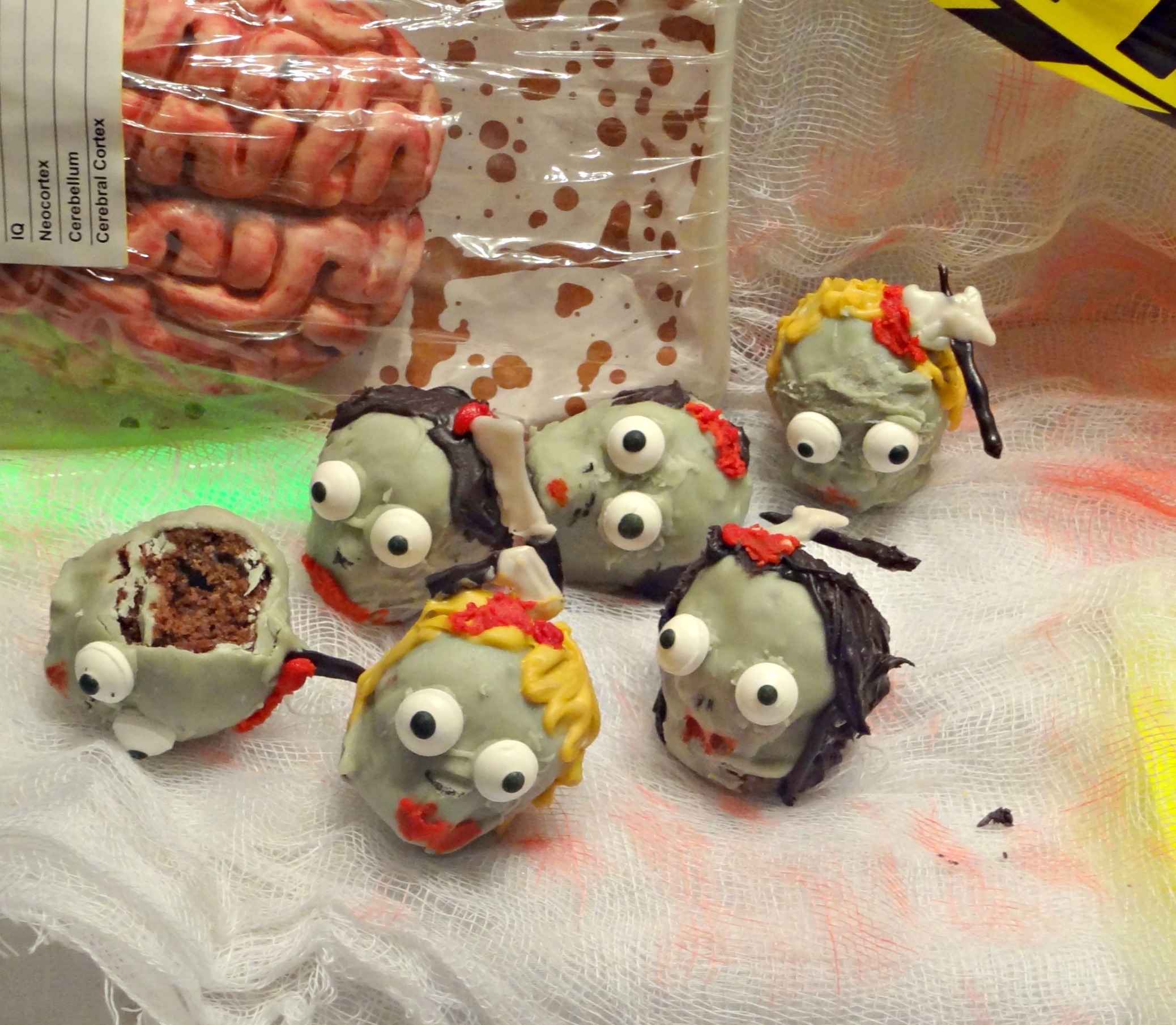 These are like cake pops…except, not on a pop..and they are brownies. So, they are zombie head brownie bites. Let’s do this thing.