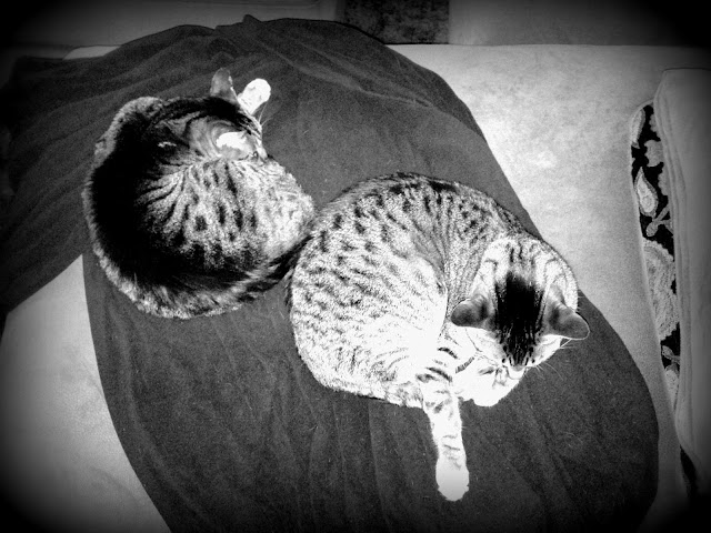 I have no reason for posting a cat picture other than I just love my cats. Plus, I got a new couch..and they clearly love it, because that's where they are always cuddled.